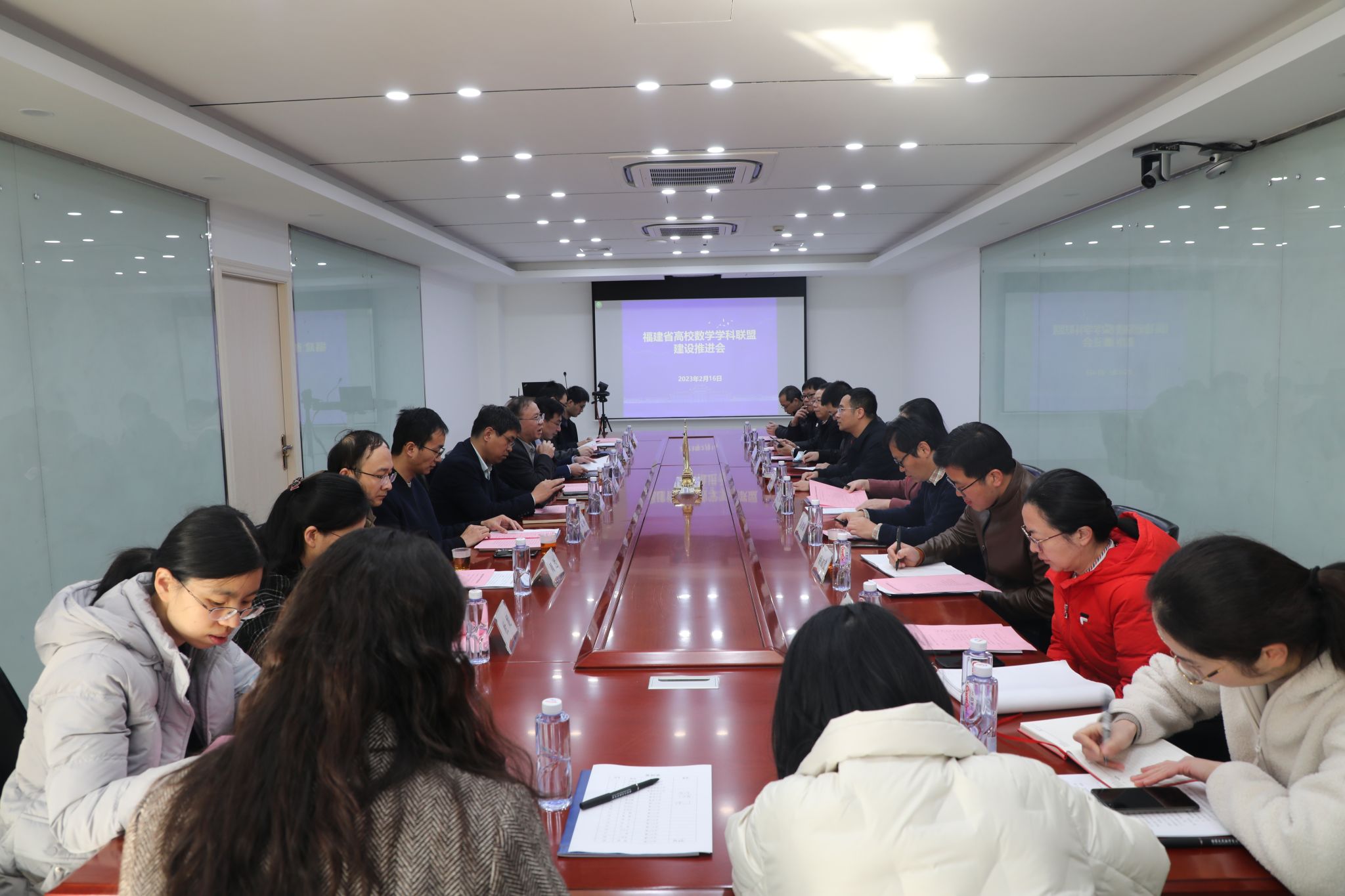 2023年2月16日上午,福建省高校数学学科联盟建设推进会在厦门大学海韵园数理大楼686会议室召开。福州大学数学与统计学院刘勇进院长、侯建锋副院长,福建师范大学数学与统计学院王健院长、沈建和副院长,集美大学理学院宾红华院长、晏卫根教授、谢加良教授,厦门大学数学科学学院谭绍滨院长等部分院级和系级班子成员以及联盟团队负责人出席会议,会议由厦门大学数学科学学院数学与应用数学系主任夏超教授主持。